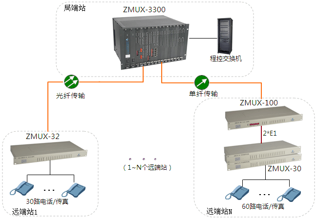 遠端N的ZMUX-30接入60路電話(可選配其它業(yè)務)復用成2路E1信號,通過E1接口(2M接口)級聯(lián)ZMUX-100,再轉(zhuǎn)換成光信號,通過光纖傳輸?shù)綄Χ巳ァ?/p>