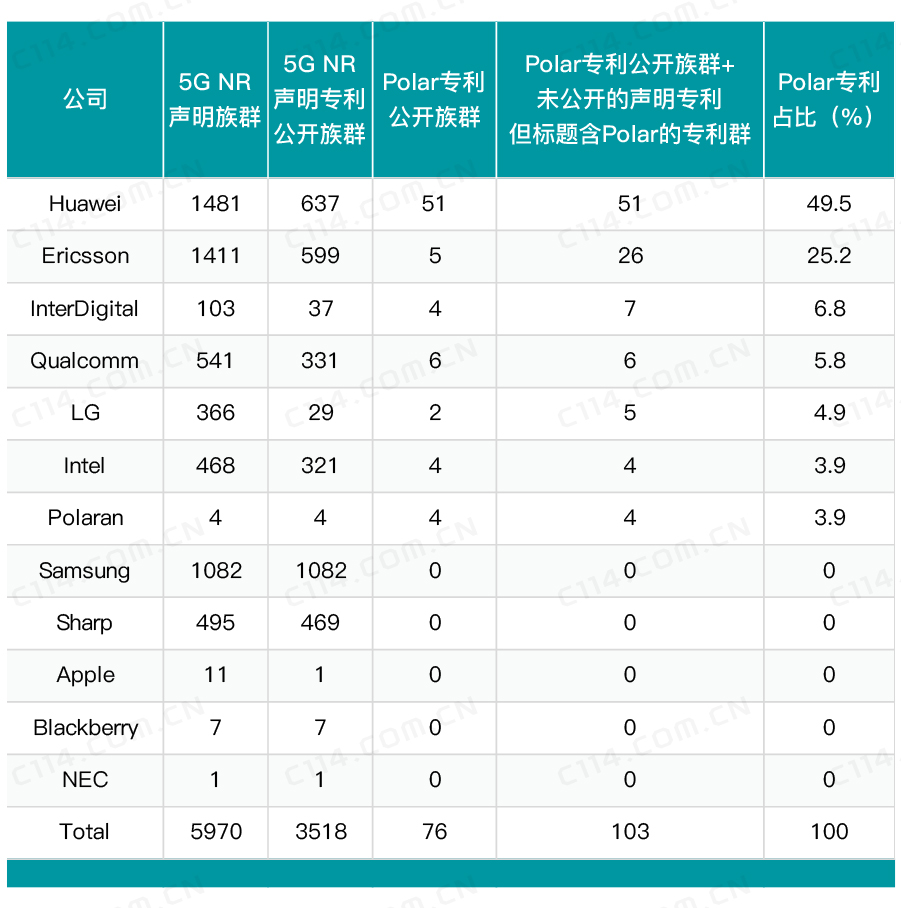 目前,5G Polar碼公布專利數量上,華為位列第一名,遠遠領先于高通。網絡上流傳了一份有關5G專利的數量清單。該份清單是以Polar碼為標準的專利技術。5G專利清單的詳細情況如下,截至2018年7月底,Polar碼技術領域共有103族專利,其中華為占據半壁江山,擁有51族專利,占比49.5%;愛立信位居第二,擁有26族,占總數的25.2%,美國Inter Digital公司以7族6.8%的占比位列第三。華為能有這樣的專利規模和占比確實是令人振奮。然而,3GPP(第三代合作伙伴計劃)定義了5G三大場景:eMBB,mMTC和URLLC。eMBB對應的是3D/超高清視頻等大流量移動寬帶業務,mMTC對應的是大規模物聯網業務,而URLLC對應的是如無人駕駛、工業自動化等需要低時延高可靠連接的業務。在5G eMBB場景上,Polar為信令信道編碼方案,LDPC碼為數據信道編碼方案,這兩者基本上平分秋色。這就是說,在eMBB的單場景下,華為占據較多的Polar碼專利。至于華為的LDPC編碼(高通主導的編碼技術)的專利數量,有網絡數據顯示為41項,相較國外廠商特別是高通等并不占優勢。另外,我們目前無法獲知華為和中興在5G其他兩大場景下的專利情況。當然,這一方面既需要3GPP先定mMTC和URLLC的編碼方案,另外一方面也需要國內的中興和華為能夠繼續在mMTC和URLLC場景專利上實現大的突破。另外,有網絡公開數據顯示,華為擁有的5G核心專利占比大約為26%,專利占比高居各廠商榜首。但是對于26%的專利占比數據,我們無法證實。